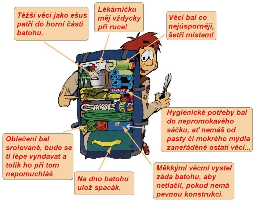Při balení batohu je potřeba dospodu balit věci, které budeš potřebovat až na konci dne (např. spacák) nebo které jsou těžké (např. konzervy). Nahoru naopak patří věci, ke kterým budeš potřebovat mít přístup během dne (pláštěnka, jídlo na cestu). Různé menší kapsy můžeš využít na drobnosti, které se vyplatí mít při ruce (doklady, baterka, mapa,...